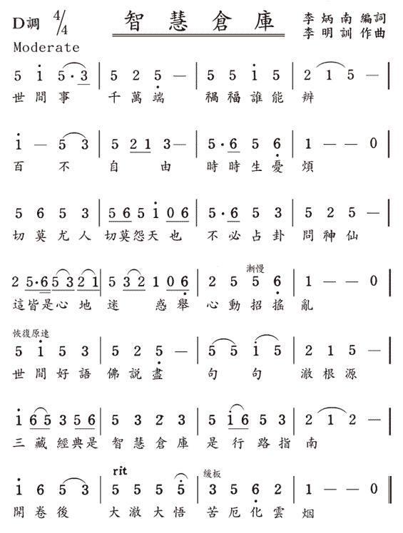 智慧倉庫李炳南編詞李明訓作曲 世間事千萬端 禍福誰能辨 百不自由 時時生憂煩 切莫尤人 切莫怨天 也不必占卦問神仙 這皆是心地迷惑 舉心動招搖亂 世間好語佛說盡 句句徹根源 三藏經典是智慧倉庫 是行路指南 開卷後大徹大悟 苦厄化雲烟