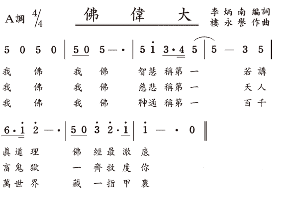 (1) 我佛 我佛 智慧稱第一 若講真道理 佛經最徹底 (2) 我佛 我佛 慈悲稱第一 天人畜鬼獄 一齊救度你 (3) 我佛 我佛 神通稱第一 百千萬世界 藏一指甲裏