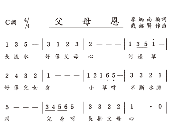 長流水 好像父母心 河邊草 好像兒女身 小草呀 不斷水滋潤 兒身呀 長掛父母心