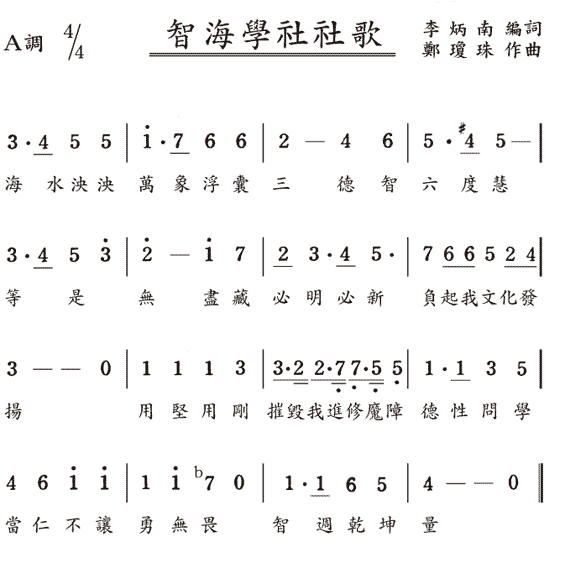 海水泱泱 萬象浮囊 三德智 六度慧 等是無盡藏 必明必新 負起我文化發揚 用堅用剛 摧毀我修魔障 德性問學 當仁不讓 勇無畏 智週乾坤量