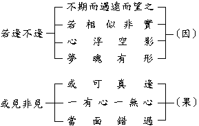 現在把「若逢」這兩個字分開講,「若」是相似,「逢」是不期而遇。「若逢」── 好像遇見了,如同在做夢,又如在日間出現了幻影,並不是真的遇見。「若逢不逢」講的是因,是講甲造的因。下面這一句「或見非見」是果。「或」是「或然」,講的是事實。甲想念乙,隨時想見,或者是真見到了。「非見」又是指什麼呢?甲在遠處望見乙,遠遠地向乙打招呼,但乙專忘,不想念甲,未見到甲。甲有心,乙無心,以致當面錯過。所以結果還是「或見非見」。