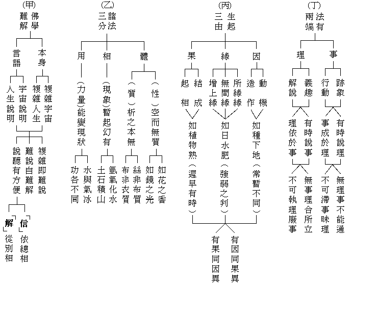 宇宙複雜,言語就複雜;人生複雜了,說明人生的言語就複雜了。其實都這樣複雜,複雜就難說了,說都這麼難了,了解當然很難解了。但是難說、難解總是要想個辦法,辦法就是方便辦法,說的人也好,聽的人也好,都要有一個方便的辦法,方便什麼呢?用這個辦法很容易的、很便利的就了解了。這個方便辦法是什麼呢?