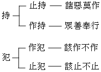 「十善」還是根據五戒來的,五戒無論如何要守得很好。前面比如說持與犯,持是怎麼樣持法?罪惡的事情就要「止持」,絕對不能做,止惡就是持住;善的事情呢,不能不做叫「作持」。一個止、一個作,就是前面講「諸惡莫作,眾善奉行」。眾善必須要作,叫作持,不作就犯了戒了,犯了持戒。諸惡必得要莫作,諸惡必須要停止,諸惡不止的話就犯了止持的戒了。「持」有這兩個意思:一個是止持,該止的就要止,該作的就作,止是止惡,作是作善,兩者都不可犯,兩者犯任何一種,持就是不夠。犯有作犯、有止犯。我們的身口意三業,隨時在輕舉妄動地,三業自己不能控制,都在作業、都在造惡業了,都能觸動我們的止持,所以犯要特別注意的。我們要注意作犯,「止犯」也要注意的,我們的三業一懈怠的話,該止的不止,該作的不作,又犯了。所謂犯就是這方面,就是針對前面持這一方面,持這一方面該止的不止、該作的不作,該作的不作你就犯了作犯了,該止的不止犯了止犯了,我們凡夫都非常容易犯的,因為一動念就讓我們身口意不能控制,所以在持戒的話,隨時起任何一個念頭,自己就要注意了。