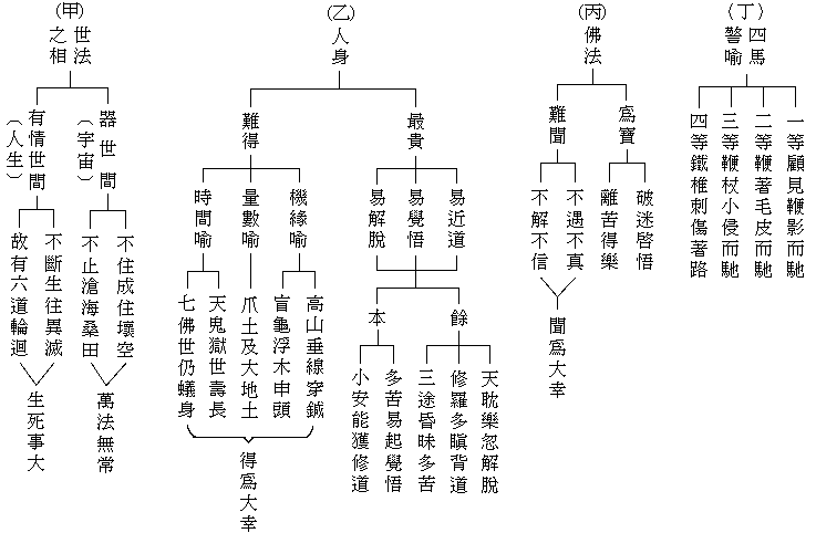 第一等馬,自己想,世間、器世間、滄海桑田不住地成住壞空,人有生住異滅、六道輪迴,一講他就明瞭了,第一等馬。第二等馬這個不算,必得要自己對於那世間痛苦要有所體驗的。第三等的時候,小小的體驗不算,必得要受到很深的挫折,給他刺激,讓他很深的感受。第四等的,就算是不小的挫折還不算,過了一段他又忘記了,第四等必得要他遭受到家破人亡,自己得了重大的疾病,到了死亡邊緣的時候,這種人讓人家告訴他佛法,他才能夠覺、能夠修,能夠這樣也就不錯啊。就有那些人,隨時家破人亡,隨著自己到死的時候,快死了他還是不修,這種還是有的。